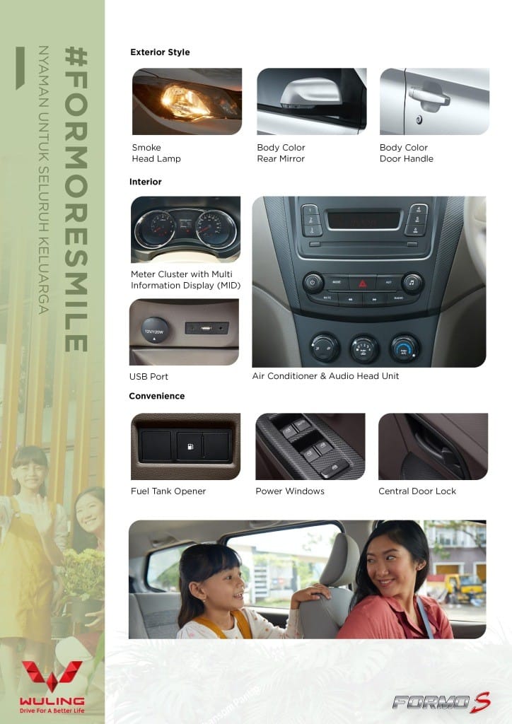 Merupakan kendaraan dengan ruang kabin lega dibandingkan kompetitor lainnya, karena memuat 5 penumpang jika digunakan sebagai kendaraan usaha dan 8 penumpang untuk kendaraan keluarga. Formo S dapat memenuhi aktivitas berkendara sehari-hari dengan kabin yang nyaman dan lega didukung storage yang memadai untuk menyimpan perangkat penting di perjalanan.